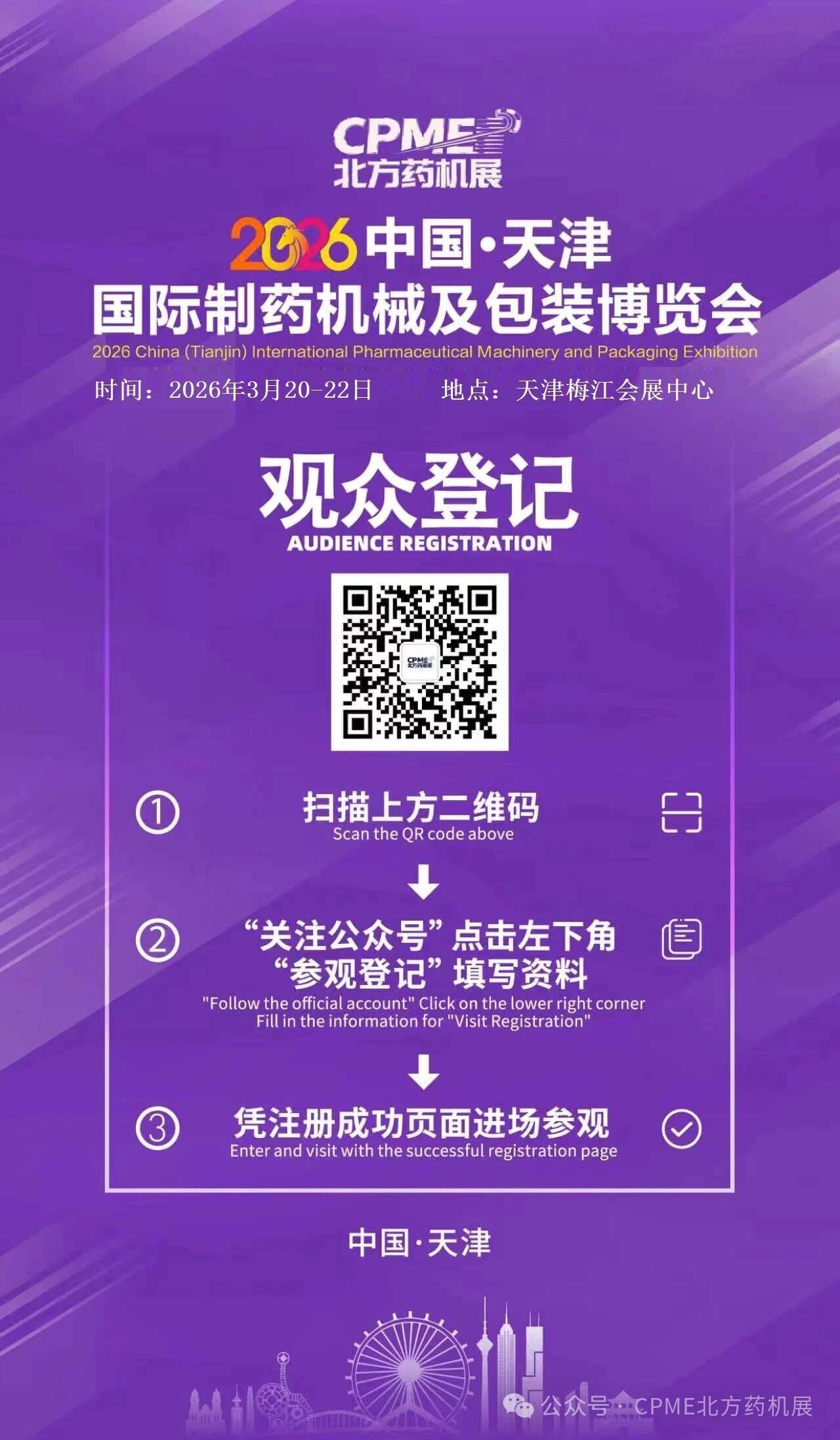 2026年3月20-22日,我们在天津梅江会展中心恭候您的到来!诚邀业界相关企业及采购商等共同聚首本届展会,共襄盛举,共谋发展! CPME中国(天津)国际制药机械及包装博览会以“从天津起步· 为全球制药装备赋能”为主题,是一个由原料药机械、粉碎机械、饮片机械、制剂机械、制药包装机械、制药包装材料、检测及实验室设备、制药用水设备等厂家与中药、生物药、化学药、农药等医药生产企业、医院制剂厂、保健品厂、食品厂、日用化工公司、制药/包装企业、原料药及中间体公司、行业协(学)会、政府主管部门等单位之 间进行展览、贸易、交流的大型专业博览会。 2026中国(天津)国际制药机械及包装博览会(简称:CPME天津药机展)将于2026年3月20-22在天津梅江会展中心举办。作为一场涵盖产品、技术以及学习交流的药机行业盛会。博览会预计展览面积达5万平米、展商数量800余家、专业观众6万人次。通过展会实现的包括现场采购、寻找合作伙伴、建立渠道、技术交流、行业论坛等活动面对面交流及合作。是企业开拓与把握北方市场趋势的绝佳平台,展会将吸引行业品牌参展,最新产品、最新技术等资讯,以丰富的展品、多方位的合作架构,广泛的行业影响力,向业界呈现出一个高层次的制药机械行业盛会!